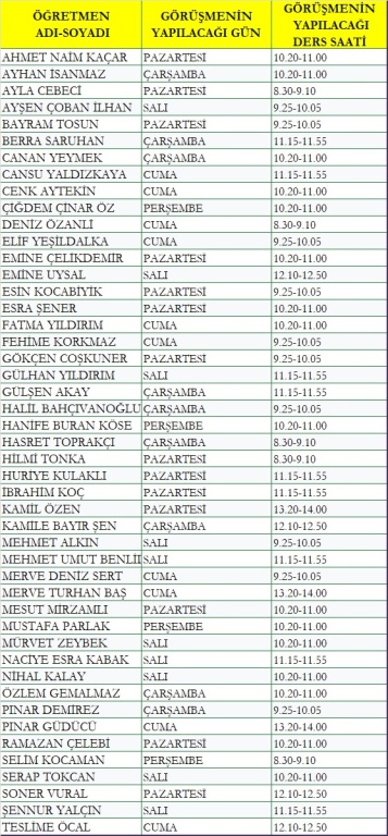 Velisi olduğunuz öğrenci hakkında görüşmek için aşağıdaki çizelgeyi dikkate alınız.